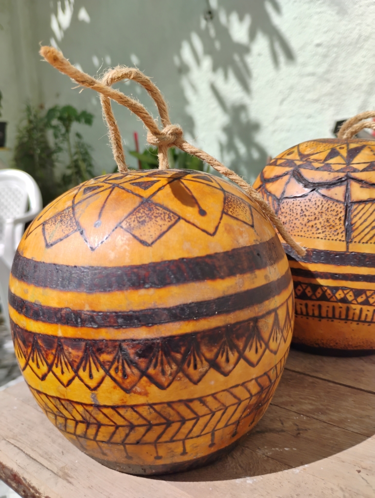 Pula para 2018. Peguei equipamento para fazer umas placas e, aos poucos, fui retomando, testando, abandonando e retornando. Um grande vai e volta. O pirógrafo quebrou e resolvi comprar outro. E foi aí que veio o convite para ilustrar cabaças para berimbau. Os primeiros fiz com tinta, mas resolvi tentar com o pirógrafo. O primeiro foi hiper teste, cheio de buracos. Mas o segundo, me deu orgulho. Já quero fazer mais.